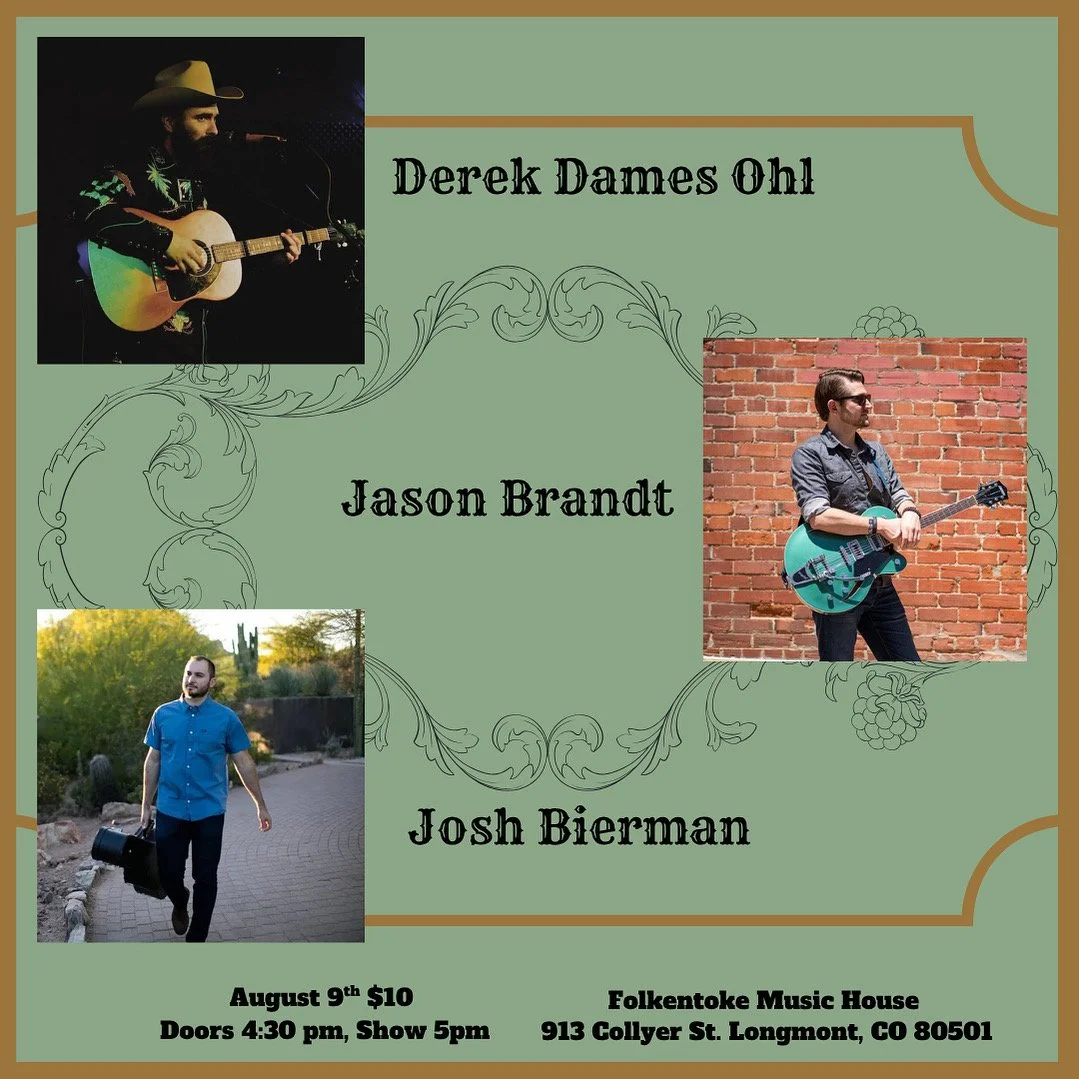 Jason Brandt is playing a solo songwriter set at Longmont’s newest community music house, the Folkentoke! I’ll be sharing the stage with two other dope Denver-area musicians, Derek Dames Ohl and Josh Bierman. There’s a $10 cover, and this early show opens at 4:30 p.m. with the show starting at 5! Come ready to take in some stories—tragic, true, and otherwise…